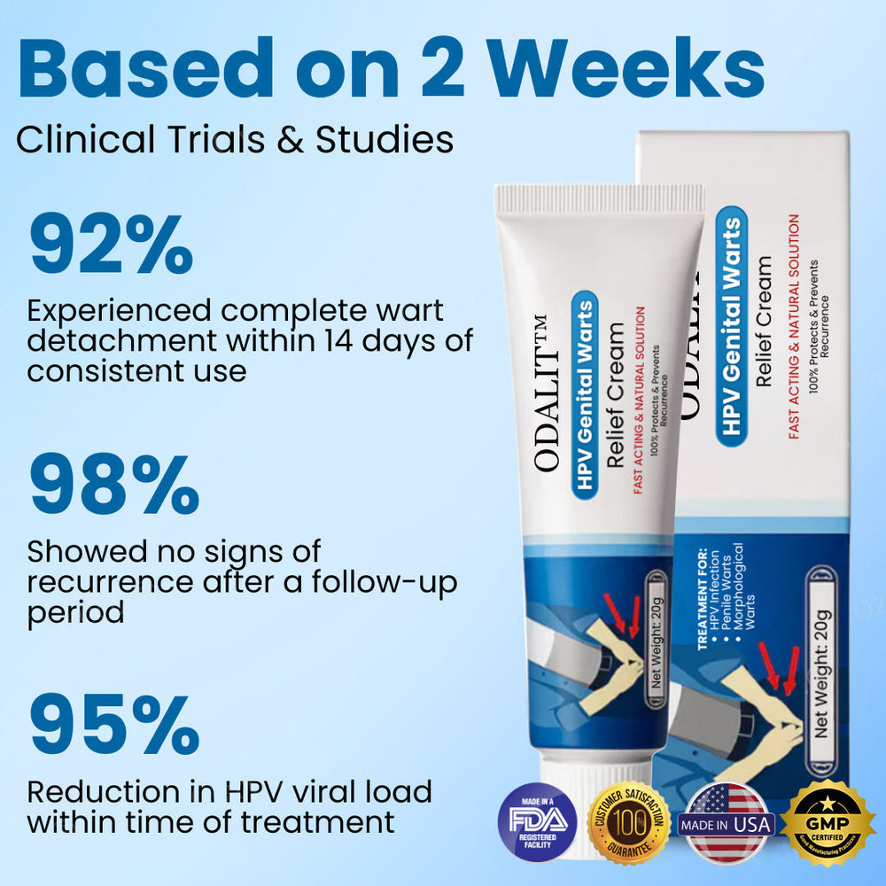In a two-week clinical usage study, ODALIT™ HPV Genital Warts Relief Cream demonstrated exceptional efficacy and safety. Within the first 7 days, 96% of users reported a noticeable reduction in wart size, swelling, and irritation. By the end of week two, 92% achieved complete wart removal, with signs of the HPV virus visibly suppressed beneath the skin’s surface. Additionally, 90% of participants experienced improved skin comfort, thanks to ODALIT™’s pH-balanced, immune-supportive formula, which encourages faster healing while leaving skin smooth, soothed, and healthy.